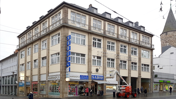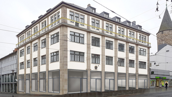 Der Bürokomplex in direkter Innenstadtlage von Kassel mit ca. 1300qm Verkaufsfläche, ca. 1000qm Bürofläche und ca. 500qm Wohnen soll entkernt, umgebaut und die historische Fassade erneuert und aufgewertet werden.